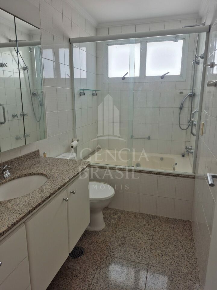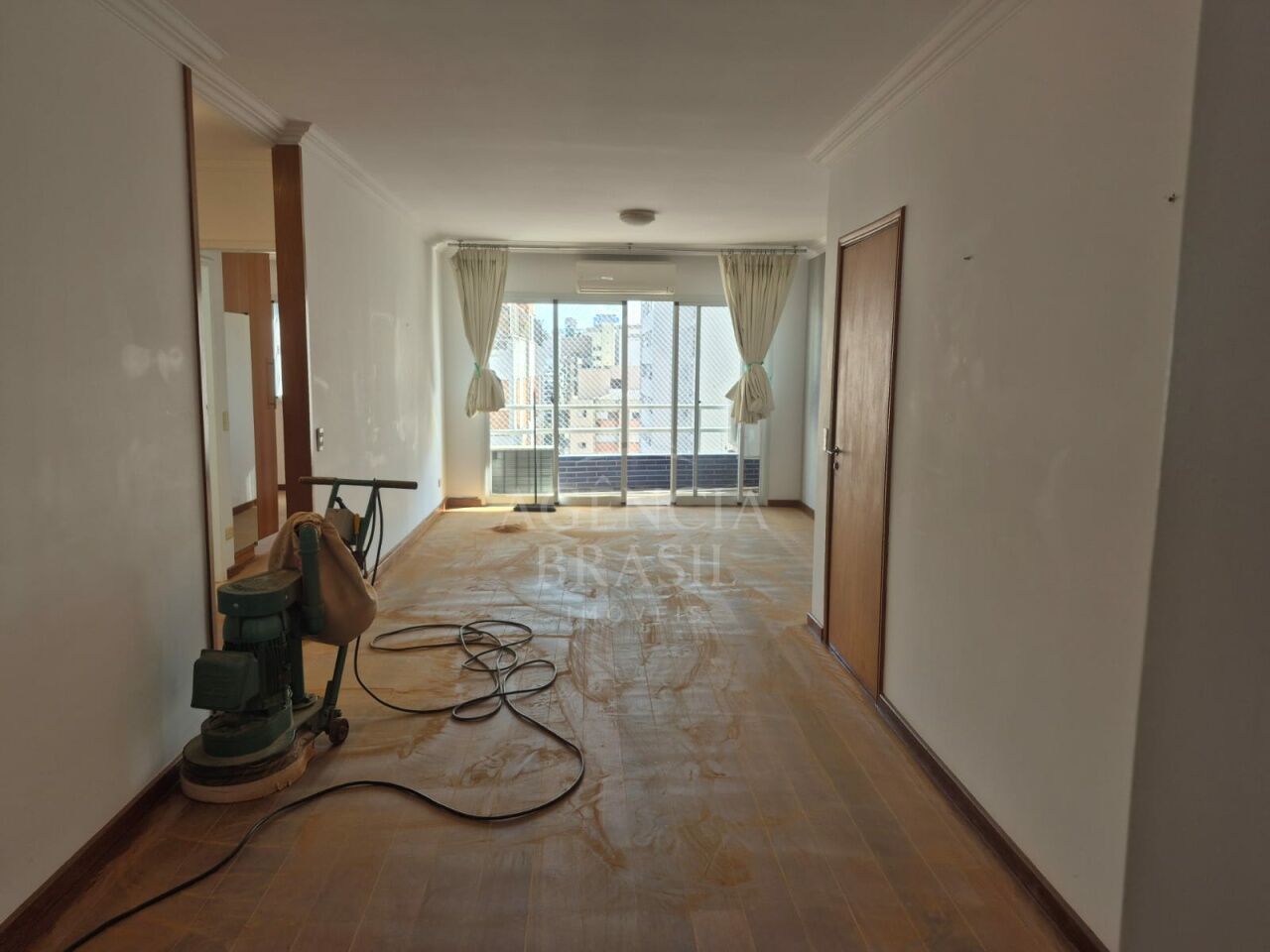 Este apartamento de 118 m², localizado no 12º andar, apresenta três dormitórios, sendo uma suíte, além de três vagas de garagem. A planta dispõe de sala climatizada, quartos com ar-condicionado, armários planejados em todos os ambientes e dependência de serviço. A área social é bem distribuída, com iluminação natural abundante e integração equilibrada entre estar e jantar.
