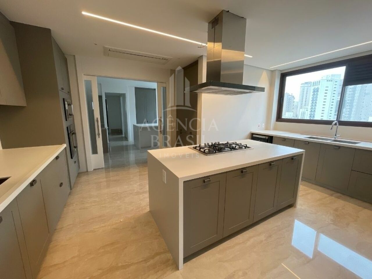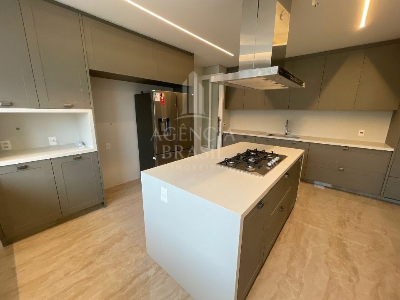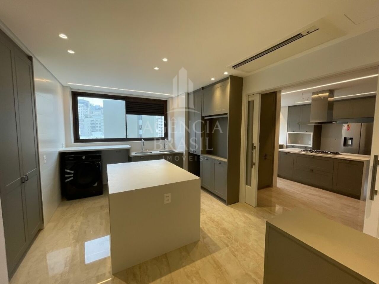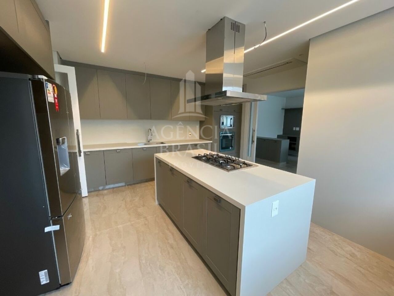 Cozinha gourmet equipada, copa, despensa e área de serviço completam a estrutura de apoio.